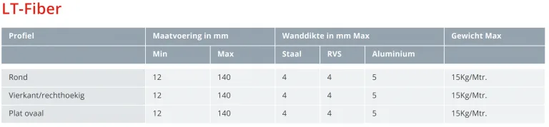 Onze machines zijn geschikt voor het snijden van veel verschillende type buizen, kokers en profielen. Onze LT-Fiber beschikt over een bundellader en is daardoor uitermate geschikt voor het snijden van grote series. Onze LT-8 beschikt tevens over een stappenlader en is daardoor uitermate geschikt voor kleinere series. Tevens is onze LT-8 in staat om grotere wanddiktes en een groter assortiment aan profielen te kunnen snijden dan onze LT-Fiber. Door het onderscheid in constructie van de invoer, ontstaat er een verschil tussen de minimale en maximale invoerlengtes op beide machines. De minimale/maximale invoerlengte is: “3200/6400mm voor de LT-Fiber, en 2500/8400mm voor de LT-8.”